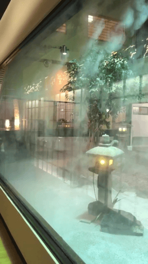 庭園と通路を隔てるガラス窓に、まるで水が流れ落ちているかのようなミストの滝を演出。